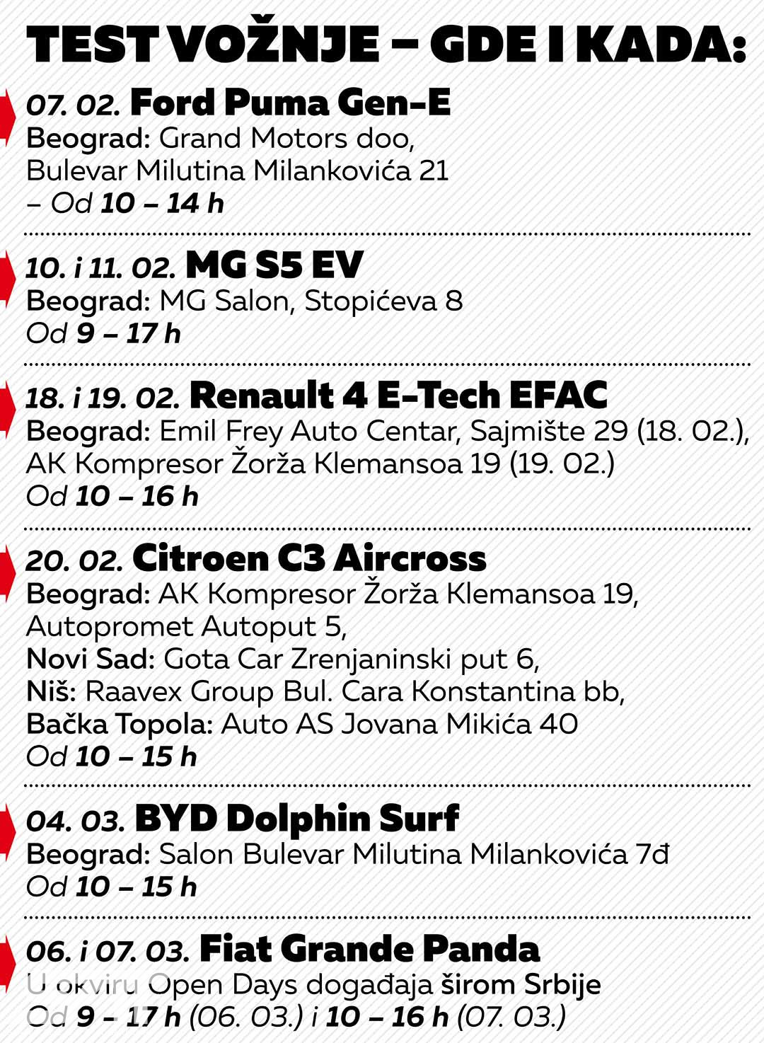 Finalisti izbora Autobest čekaju vas u zakazano vreme, kako bi mogli da ih probate i ocenite, a vaše mišljenje potom utiče na to ko će biti pobednik u izboru za najbolji automobil. Po prvi put, publika iz 32 zemlje, a ne samo specijalizovani novinari, učestvuje u izboru, a mi objavljujemo raspored, odnosno datume i adrese gde vas čekaju automobili za test-vožnje.